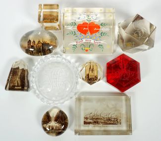 Sammlung von 10, 1850-1930, versch. Formen, meist Monogramme o. Andenken, tlw. Fotos, u.a. Dom zu Münster in Westf., Cascaden in Kassel-Wilhelmshöhe, Kölne Dom, Bad Ottenstein, Saechsische Gussstahl Fabrik Doehlen bei Dresden u. Romker Wasserfall im Okertal im Harz u. Emaillemalerei von Tauben u. Herzen auf Panzerprisma, dieses Bayr. Wald, ca. 1945/46, H von 2,5 bis 6,5 cm, min. altersbedingte Gebrauchsspuren, tlw. best. (ex Coll. Peter v. Brackel)