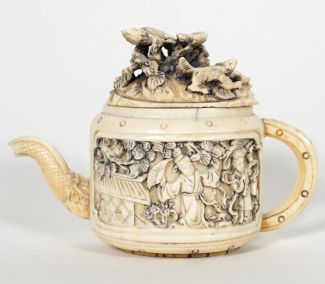 China, 19.Jh., Elfenbein, geschnitzt u getuscht, ovaler Stand, entspr. Wandung, dort 2 filigrane Flachreliefs einer Genreszene, Elefantenrüsseltülle, C- Henkel (beides angesetzt), im eingesetzten Boden Haarriss u Mäandergravur, orig. Deckel mit Natursockel, dort 2 stilisierte Fo-Hunde (Figurenknauf restauriert), unterseitig Mstr.zeichen, ca. 7 x 10 cm, mit aktueller EU-Bescheinigung für kommerzielle Tätigkeiten