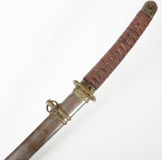 Japan, Meiji-Periode, für Offiziere der kaiserlichen Armee, Griff mit Rochenhaut u Stoffwicklung, dort je Seite 1 Menuki, blanke Klinge, Klingenarretierung, Metallscheide, diese mit Flugrost, mit 3 Messingbeschlägen,1 Tragöse, L über alles ca. 102 cm