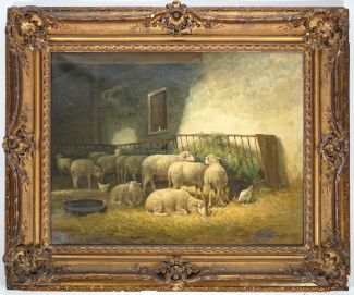 J. L., französische/r Künstler/in 19. Jh., ÖL/Lw., Schafe im Stall, rechts unten sign., 50 x 65 cm, verso mehrere Flickendubletten und retuschiert, StuckGR (best und rest)