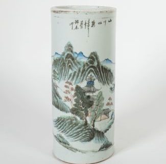 China, um 1900, Porzellan, zylindrische Form, i d Wandung stilisierte River Lee-Landschaft, Goldrand (berieben), unterhalb Bezeichnung, rote Stempelmarke über Glasur, H 28,5 cm