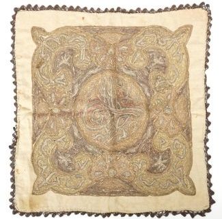 Osmanisches Reich, 19.Jh., quadratische Form, sog. Gold- u Silberfaden-Stickerei, zentral Tughra, umlaufend axialgespiegeltes Arabesken, umlaufende Bordüre, ca. 45 x 45 cm