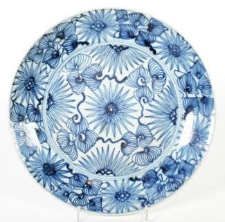 China, 18./19. Jh. Porzellan, blaumonochrome unter Glasurmalerei, u.a. Floraldekor, Dm ca. 25,5 cm, blaue Schriftzeichenmarke unter Glasur, alter Haarriss, 3x randig alt bestoßen