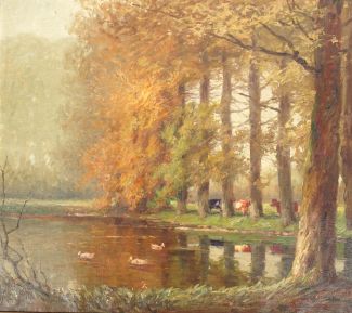 Öl/Lw, herbstliche Landschaft mit Baumallee, Kühen und Enten, 59 x 68 cm, GoldR dieser best.