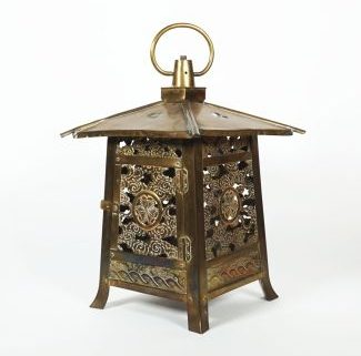 Japan, Meiji-Epoche, Messing, getrieben, durchbrochen gearbeitet, tlw. reliefiert, Pagodenform, in den 4 Seiten Wolkendekor (1 x Türchen), zentral Wappen bzw. Samurai Moncho „Aizu Aoi“, in der Basis umlaufend Wellenbordüre, im Dach stilisierte Wolken, zentral Schornstein mit Tragegriff, überalles 42 x 26,5 x 26,5 cm, Brenner nicht anbei, tlw. Altersbedingte Gebrauchsspuren bzw. kl. Dellen