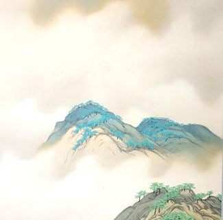 Japan, Tusche/Papier, Blick über Bergwald auf Berg Fuji, Rollenabschluß Bein, ca. 210 x 60,5 cm, unten rechts Schriftzeichen u rote Stempelmarke, in Holzschatulle