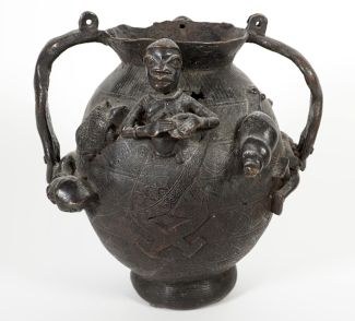 Benin, Bronze, dunkel patiniert, i d Wandung vollplastische Figuren, auch Schildkröte u Schnecke, seitlich 2 Schlangen als Griffe, H ca. 27,5 cm, herstellungsbedingte Beschädigungen
