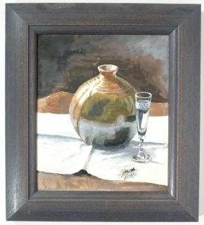 Öl/Malkarton, nature morte, Stillleben mit Krug und Wespe, links unten monogr und dat 2000, 26 x 22 cm, HR