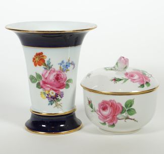 Staatl Porzellanmanuf Meissen, goldsilhouettiert, bestehend aus: Kratervase, kobaltblauer Stand und Rand, in der Wandung Blumenbouquet, H. 13,5 cm und Zuckerdeckeldose, Dekor Rote Rose, 9,5 x 10cm, Rosenknauf min best., je blaue Schwertermarke unter Glasur, 1x 2 Schleifstriche