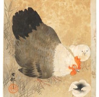 Tusche/Papier, Henne mit 2 Küken, rechts unten sign u -bez., Blattmaß ca. 27 x 19 cm, Papier altersbedingt gebräunt, im PP-Ausschnit stärker, fleckig