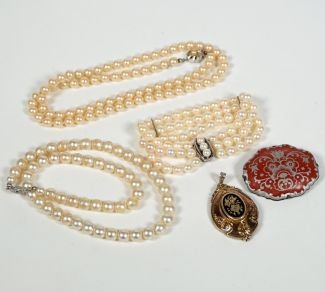 versch Hersteller, bestehend aus: Anhänger, Historismus Epoche, 333er geprägter Goldschaum, verso Silberboden, hochoval, Rocaille und Vegetaldekor, zentral Onyxplättchen, dort Goldblumenintarsie, über alles H 5 cm, Gebrauchsspuren/bestoßen, ca 10,18gr total, Brosche, Porzellanmanuf Rosenthal/Selb, Silbermalerei auf rotem Grund, 4 x 5 cm und 2 Perlenketten/bzw 1 -armband mit 835er/925er Silberschließen, L. 43 und 58 sowie 18 cm