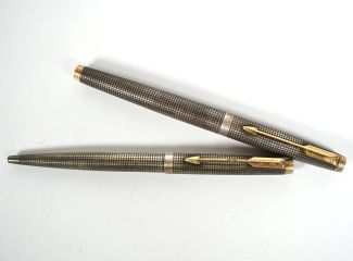 Konvolut von 2, Herst Parker/Newhaven, 1x 14K-Goldfeder, je 925er Silbermanschette und -deckel, Gittermuster, L. 12,7 cm