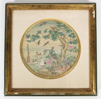 China, um 1910, Paradieslandschaft mit Vögeln, links seitlich sign sowie roter Künstlerstempel, hinter Glas, tondoförmiges Passepartout, HR (dieser besch), tlw fleckig, Seide tlw besch