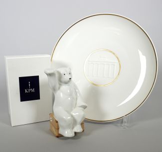 KPM/Berlin, sitzend, polychromiert, H 13,5 cm, dazu Geschenkkarton und Wandteller/Jubiläumsteller der Confisserie Sawade, im Spiegel Biskuitrelief Brandenburgen Tor, Dm. 25 cm, je blaue Zeptermarke unter Glasur