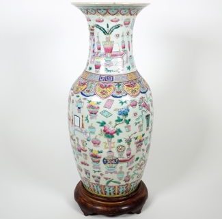China, 2. Hälfte 19. Jh., Cantonware, famille rose, Porzellan, polychrome Emaillemalerei, allseits buddhistische Symbole, variierende Bordüren u.a. Fledermaus u. Mäander, H 44,5 cm, randig min. alt best., passender Holzstand, über alles 48,5 cm
