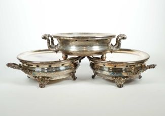 Frankreich, Historismus-Epoche, Herst. HK, versilbert, Korpus auf 4 Volutenfüßchen, mit Rocaillen u Vegetabildekor, entspr. Griffe, i d Wandung perforiert, orig. Brenner, ca. 11 x 34 cm, dazu 1 Weiteres, Herst. FH, je MZ