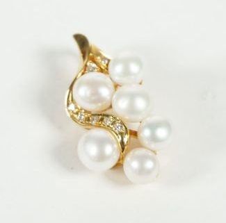 Form einer Weinrebe, 6 Perlen begleitet von 7 Diamantsplittern, Bügelöse, MZ, Beschau, 2,7 x 1,7 cm, ca 4,12gr 750er Gold total