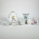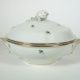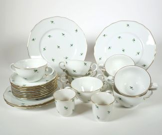 Porzellanmanuf Augarten/Wien, Dekor Weinlaubstreuer, goldsilhouettiert, bestehend aus: 8 Suppentassen mit Unterer, zwei Menuetellern Dm 24,5 cm, zwei Frühstückstellern und zwei Becherchen, blaue Stempel- und rote Marke unter/über Glasur
