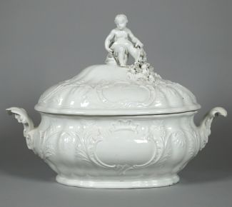 Königl. Porzmanuf. Meissen. 1774f, Marcolini-Epoche, weiß, ovaler mehrfach gewellter Stand, entspr. godronierte Wandung u. Deckel, allseits Rocaillerelief mit Blumen, vollplastischer Puttoknauf Füllhorn ausschüttend, bossierte Blüten und Früchte, tlw. best., Blattgriffe (je rest.), blaue Schwertermarke, ca. 27 x 36 x 20 cm, Stand min. best.