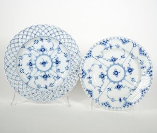 Porzellanmanuf Royal Copenhagen, Musselmalet Vollspitze, Dm 25,5 und 23 cm, blaue Wellen- sowie grüne Stempelmarke sowie Modellnr 1098 und 1085, je 1. Wahl