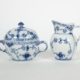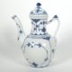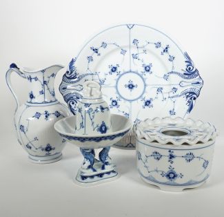 Manuf Royal Copenhagen, Musselmalet gerippt, bestehend aus: Kakaokanne (Deckel fehlt), Rechaud 2tlg. sowie Servierplatte 32 x 28 cm, blaue Wellen- sowie grüne Stempelmarke sowie Modellnr 497, 4846, 319 sowie Manuf Bing & Gröndahl, Tischglocke und Fußschale H 10,5 cm, je 1. Wahl