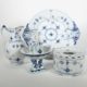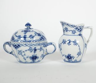 2tlg., Porzellanmanuf Royal Copenhagen, Musselmalet Halbspitze, Zuckerdeckeldose und Sahnekännchen, blaue Wellen- sowie grüne Stempelmarke sowie Modellnr 691 und 522, je 1. Wahl