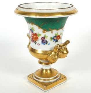 Thüringen/Böhmen, Biedermeier Epoche, Porzellan, reich vergoldet, in der Wandung Blumenbouquet, seitliche Handhaben mit Maskeronanstöße, H. 17,5 cm, altverschraubt, tlw min berieben