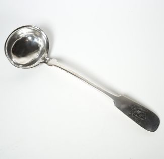 Manuf. C.T., Historismus-Epoche, Altspatenform, MZ, Beschau, ca. 240g 800er-Silber, Eigentümermonogramm, L ca. 34 cm, in der Laffe mehrere Dellen
