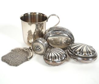 versch Manuf und Stile, bestehend aus: Henkelbecher, glatt, in der Wandung Eigentümergravur „Karen“, 4 Pillendöschen, 2x muschelförmig, je reliefiert ua Rocaillen, Blüten, 2x innen Stoffauskleidung, 2x Reste von Innenvergoldung, Dm 3,5 bzw 4,5 x 5 bis 5 x 7 cm, 1x Eigentümermonogr EB und Kleingeldtäschen, meist MZ, Beschau, zus ca 210gr min 800er Silber total, 1x kl Delle