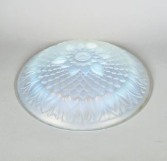 Art-Déco-Epoche, Frankreich, Opalglas, rund, gewölbt, Relief einer stilisierten Sonnenblume, 7,5 x 30 cm