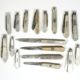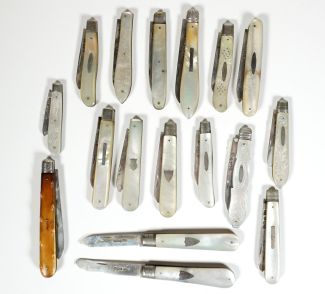 Klappmesser, Sammlung von 16 + 1, England, 1855-1930, versch Hersteller, je Perlmuttgriffe, tlw graviert, L. über alles 9 bis 14,5 cm, dazu ein weiteres jedoch anderer Schaft, je MZ, Beschau, zus ca 325gr min 925er Silber total, min Gebrauchsspuren, 2x Perlmutt besch