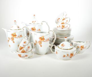 Gerti für Porzellanmanuf Thomas Bavaria, Art Deco-Epoche, Kaffeeservice, Luna, Floraldekor, bestehend aus: zwei Kannen, Milchkrug, Zuckerdose, Milchkännchen, 6 dreiteilige Gedecke dazu 4 Tellerchen und 2 Untertassen, grüne Stempelmarke unter Glasur