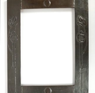 Jugendstil Epoche, Holz, Kupferblechummantelung, dunkel patiniert, geprägt, seitlich Blumenreliefs, oben und unten Kreisrelief, Ausschnittsmaß 58,5 x 40,5 cm, über alles 75 x 61 cm