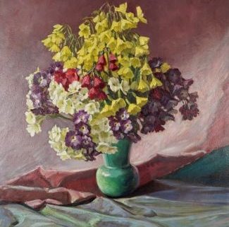 Künstler/in, 20.Jh., Öl/Hartfaserplatte, Nature Morte, Frühlingsstrauß in grüner Vase, oben rechts monogr. u dat 1955, ca. 54 x 49 cm, SilberstuckR