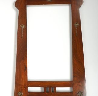 Jugendstil Epoche, Mahagoni, hochrechteckig konisch, abgerundete Ecken, Messingapplikationen, Rosetten und weibliche Gesichter, Ausschnittsmaß 46 x 26,5 cm, über alles 64 x 40,5 bzw 43 cm, Gebrauchsspuren