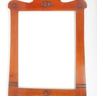 Jugendstil Epoche, Nussbaumfurnier, rot gebeizt, hochrechteckig, geschwungener Abschluss, Metallapplikationen, Ringe und Bänder, Ausschnittsmaß 61,5 x 45,2 cm, über alles 80 x 62 cm, Gebrauchsspuren