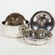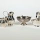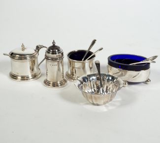 Konvolut von 5, meist England, bestehend aus: 3 Schälchen, ein Streuer (Glas/Öffnung klemmt) und ein Döschen, 1x auf vier Kugelfüßchen, 1x Klappdeckel (lose), 4x orig kobaltblaues Glas (tlw randig best.), dazu 4 Löffelchen, je MZ, Beschau, zus ca 103gr Silber (ohne Streuer und Glas gewogen), dazu zwei weitere versilberte Löffelchen