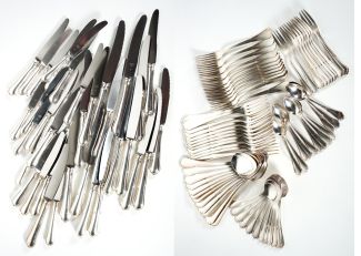 Manuf Bremer Silberwarenfabrik, für 12 Personen, Form Englisch Chippendale, bestehend aus: Menuegabeln und -messern, Suppenlöffeln, Kuchengabeln, Teelöffeln, Kompottlöffeln, Dessertmessern, Frühstücksgabeln und -messern, je MZ, Beschau, zus ca 2930gr 800er Silber (ohne Messer gewogen)