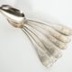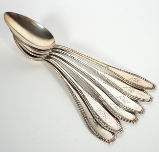 Satz von 6, 1910er-Jahre, Manufaktur Franz Bahner/Düsseldorf, Keulenstiele, Profilrand mit Flachreliefbordüre, Eigentümermonogramm, MZ, Beschau, zus. ca. 308g 800er-Silber, Verkäufermarke Gustav Elsaesser