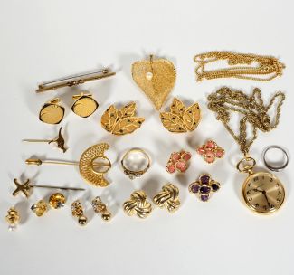 vergoldet, versch Hersteller, bestehend aus: Paar Ohrclips in Blattform mit grünen Farbsteinen, Paar Manschettenknöpfe, Brosche in Blattform mit Perle, DTU, Herst Ornata, Kordelkette, L. 68 cm, Paar Ohrclipse in Knotenform, Paar Ohrstecker mit farblosen Stein, 3 Krawattennadeln, Kette, Stabbrosche mit 3 leeren Fassungen, Paar Blütenohrclips mit Lagenachat, Anstecker mit Perle, einzelner Ohrclip mit Amethyst, Ringmariage mit Perle und Paar Damenmanschettenknöpfe, dazu Silberring mit Rubinsplitter