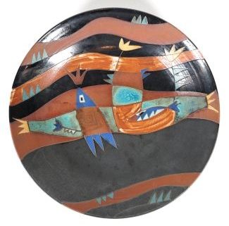 2. Hälfte 20. Jh., Terrakotta, große runde Form, semiabstrakter Ritzdekor, versch farbig glasiert, Ritzmonogr., 44,5 x 7 cm