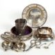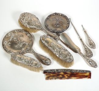 9tlg, je 925er Silberblechmontage, Manuf Mauser Manufacturing Co./New York, Rokoko Stil, reliefierte Rocaillen, Rosen und Putti, 8x Eigentümermonogr EB, bestehend aus: Silberdeckel (Glas besch), 3 versch Bürsten, Schuhanzieher, Kamm, zwei Ankleidehaken und Handspiegel, je MZ, Beschau, zus ca 765gr total, tlw gedellt
