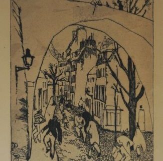 Radierung, „Die grüne Brücke“, 1910/11, links oben in der Platte sign. mit „Leinoel Einfinger“, verso Papieretikett Galerie Nierendorf/Berlin, WVZ Prasse E22, Plattenmaß 27,5 x 19,5 cm, Passerpartout, hinter Glas, Holzleiste,