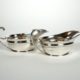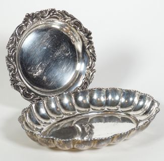 Manuf Bruckmann & Söhne/Heilbronn, längsovale Form, umlaufend gebuckelt, Perlrand, 3,5 x 23,5 x 18 cm, MZ, Beschau, ca 185gr 800er Silber, dazu versilberter Flaschenuntersetzer