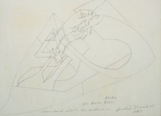 Bleistift/Papier, „eine Hand wäscht die andere“, unten rechts sign, betitelt, dat 1969 und Widmung, Blattmaß ca 15 x 20 cm, min, stockfleckig, hinter Glas, HR