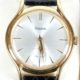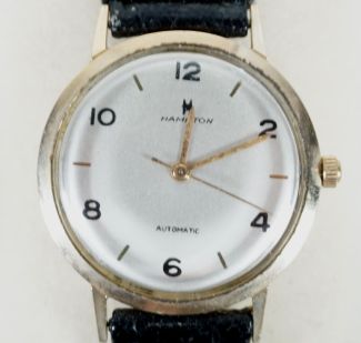 Herst. Hamilton/Lancaster Pa., Automatic, 1950er-Jahre, 10k-vergoldetes Gehäuse, silbernes Zifferblatt, Goldzeiger, Strich- u arabische Indices, MZ, ca. 4 x 3,5 cm, Werk läuft an, späteres Lederarmband