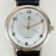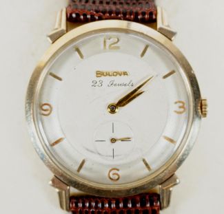 Herst. Bulova/Biel, 23 Jewels, 1940er/50er-Jahre, 10k vergoldetes Gehäuse, silbernes Zifferblatt, Goldzeiger, Strich- u arabische Indices, dezentrale Sekunde, MZ, ca. 4 x 3,7 cm, num. L8 bzw. C885714, Werk läuft an, späteres Lederarmband