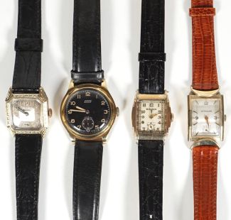 Konvolut von 4, je vergoldete Gehäuse, Hersteller Bulova, Wittnauer, Eros und 1x unleserliches MZ, 1x runges sonst eckiges Zifferblatt, je dezentrale Sekunde und Kronenaufzug, 2x Werk läuft an, je späteres Lederarmband, Gebrauchsspuren, tlw berieben
