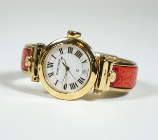 Herst Philippe Charriol/Genf, Ref.-Nr. 20.97.305, Quarzwerk (nicht geprüft), Edelstahl vergoldetes Uhrgehäuse und -armband, rundes Zifferblatt, röm Indices, goldfarbene Leuchtzeiger, Datumsnische, Dm Zifferblatt 2,5 cm, aufgelegtes rotes Lederband mit Druckschließe, MZ