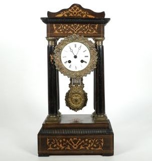 Frankreich, 2. Hälfte 19. Jh., Holzgehäuse als architektonischer Aufbau, rechteckiger einfach getreppter Sockel, 4 ebonisierte Konussäulen mit Messingkapitellen und -basen, rechteckiges Dach mit geschweiftem Aufsatz tragend, in der Front Intarisendekor, geprägte Messinglunette, entpsr Prunkpendel (Aufhängung defekt), Emaillezifferblatt (rissig), röm Indices, gebläute Zeiger, Halbstundenschlag auf Glocke, Messingplatinenwerk, 44,5 x 13,5 x 22 cm, unrestauriert, tlw min besch Gehäuse